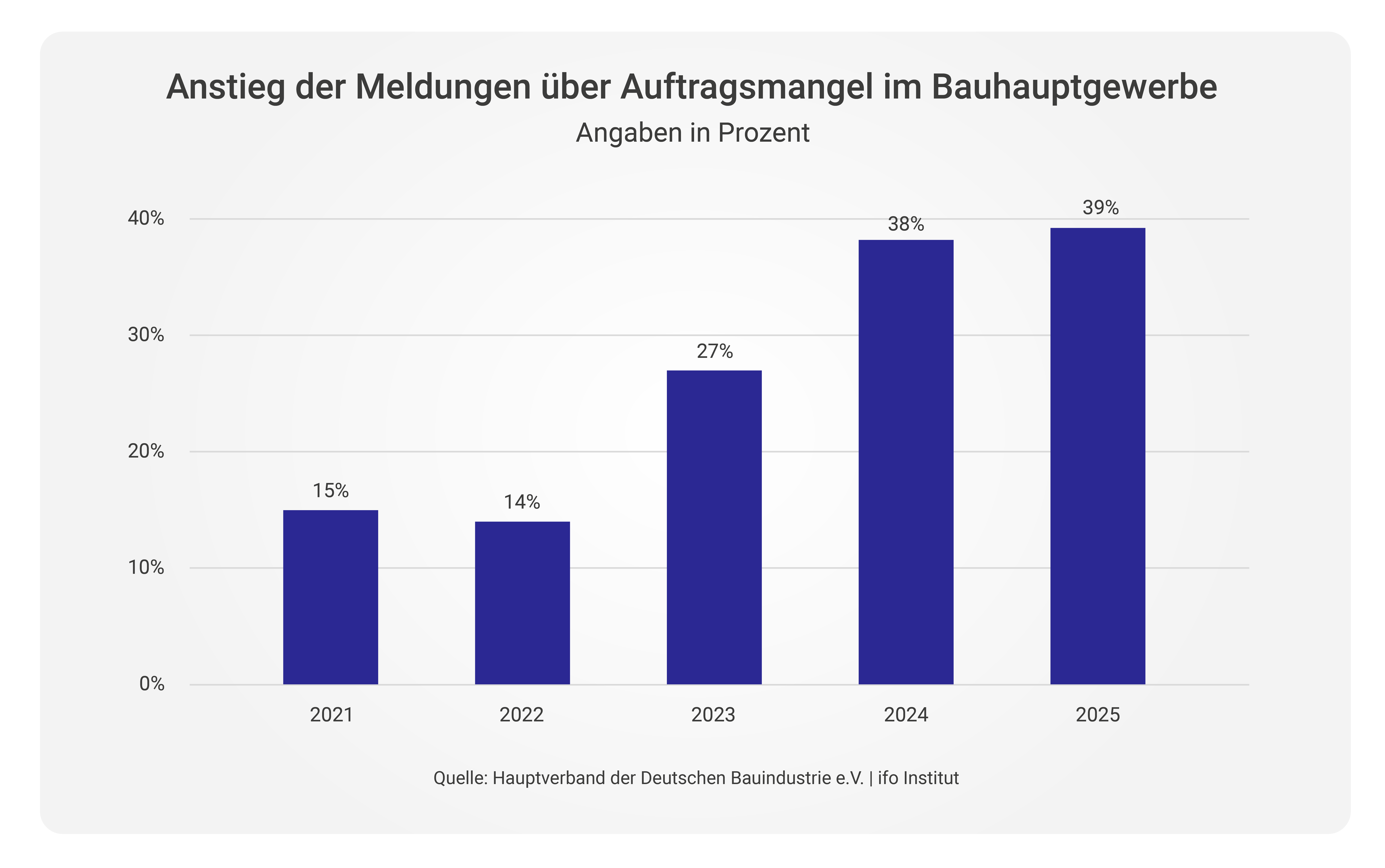 Zwar scheint das Schlimmste inzwischen überstanden, doch die Skepsis bleibt. Laut aktuellen Zahlen des Hauptverbands der Deutschen Bauindustrie klagten im September 2025 noch immer 38 % der vom ifo-Institut befragten Bauunternehmen über Auftragsmangel. Im Wohnungsbau waren es sogar 47 %.